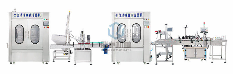 1.全自動(dòng)生產(chǎn)線流程:人工把瓶放到輸送帶上-自動(dòng)灌裝醬料-自動(dòng)理蓋下蓋-自動(dòng)抽真空旋蓋-自動(dòng)打碼-自動(dòng)貼標(biāo)-人工收瓶 灌裝采用伺服驅(qū)動(dòng)活塞定量灌裝,無泄漏無污染維護(hù)簡(jiǎn)單,灌裝精度高,灌裝穩(wěn)定。