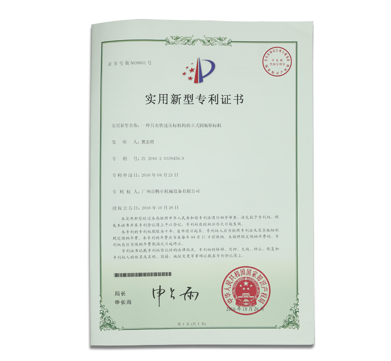 騰卓機械專利生產(chǎn)證書,專業(yè)制造包裝設(shè)備的生產(chǎn)廠家,全自動及半自動的洗瓶機,烘干機,灌裝機,旋蓋機,貼標(biāo)機,套標(biāo)機,打碼機等非標(biāo)定制自動化包裝生產(chǎn)線