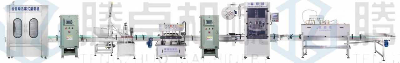 完成動作:人工放瓶-自動灌裝-機器放蓋-自動旋蓋–自動套標(biāo)收縮-人工收瓶