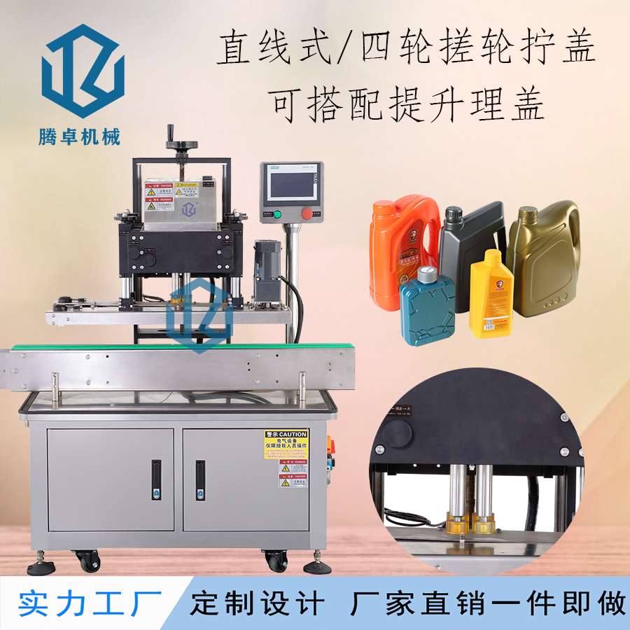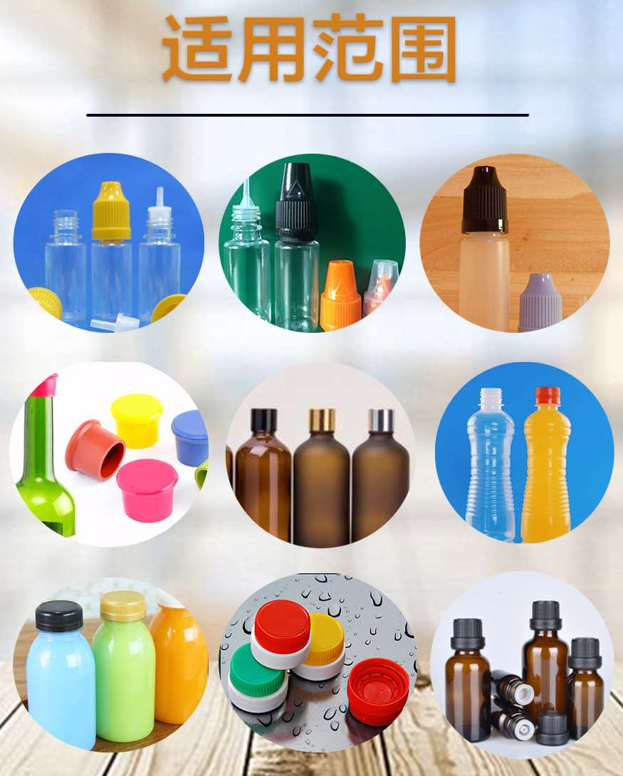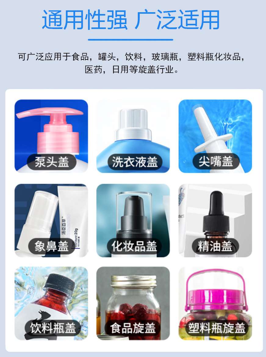 本機主要適用于螺絲紋平頭塑料蓋旋蓋擰緊,例:潤滑油桶、礦泉水瓶、藥瓶、日化用品、飲料瓶等。調(diào)節(jié)簡單,使用方便??杉嫒荻喾N瓶子蓋子。