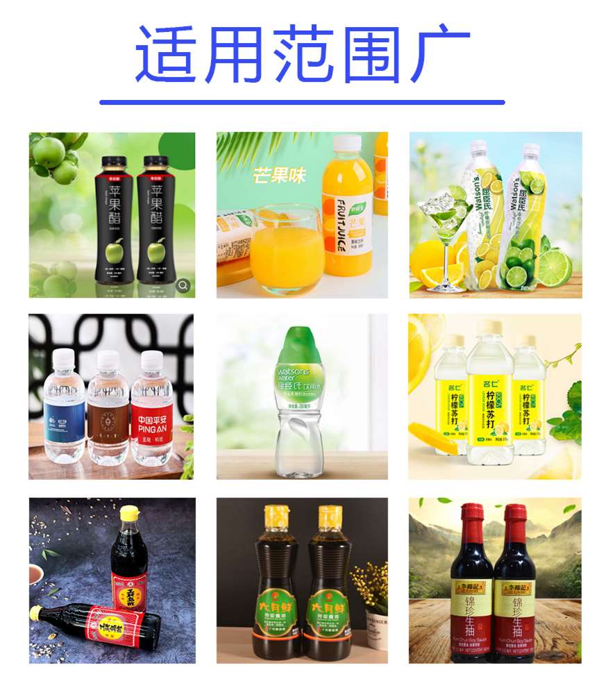 此生產(chǎn)線主要應(yīng)用于食品廠,酒廠,日化廠,化工廠,汽車用品等行業(yè)。例如:各種酒類,醋,醬油,飲料,水,剎車油,汽油添加劑等,設(shè)備采用先進(jìn)的光、電、氣一體化自動(dòng)控制系統(tǒng),實(shí)現(xiàn)進(jìn)瓶,定位,灌裝,出瓶自動(dòng)化生產(chǎn)。